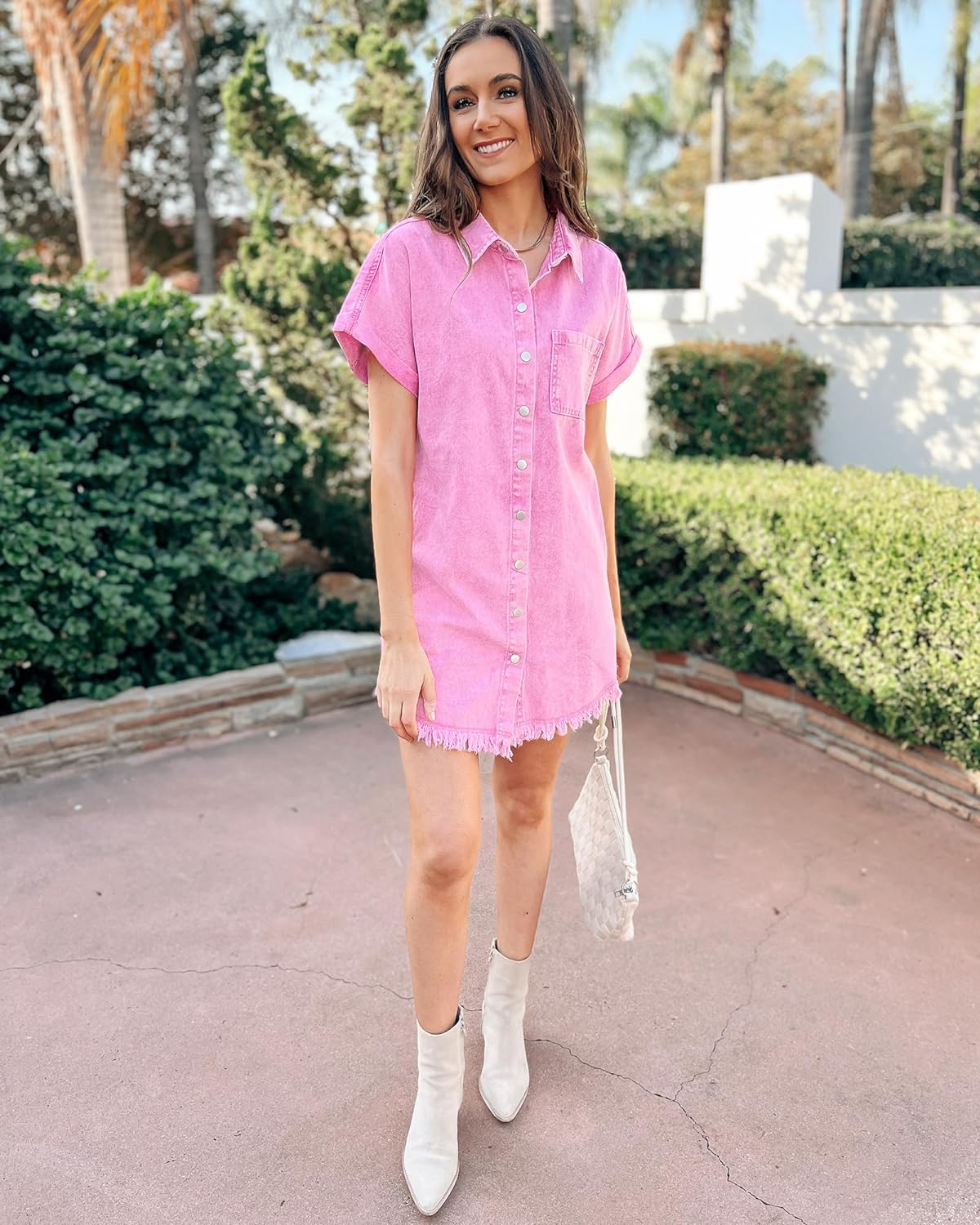 luvamia Denim Dress for Women Button Down Short Sleeves Casual Summer Jean Shirt Dresses with Pockets Frayed Hem